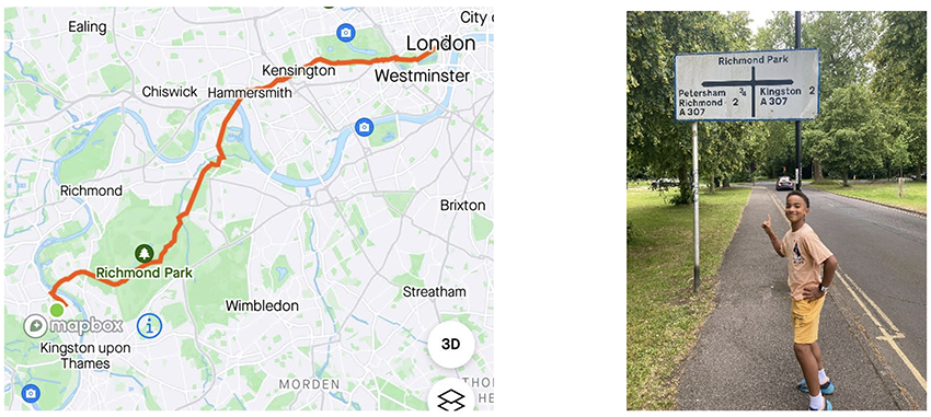 Darren’s son Ibrahim (Ibi to his friends) wanted to do something in honour of his late sister and decided to embark upon a charity walk on 22nd June, the birthday anniversary of his late sister. So, he decided to raise money for Shooting Star Children’s Hospices and set a target of £120. Ibi, aged 11, and Darren set off at 09:00 to walk from Teddington to Charing Cross and completed the 20km walk in 4 hours 20 mins.